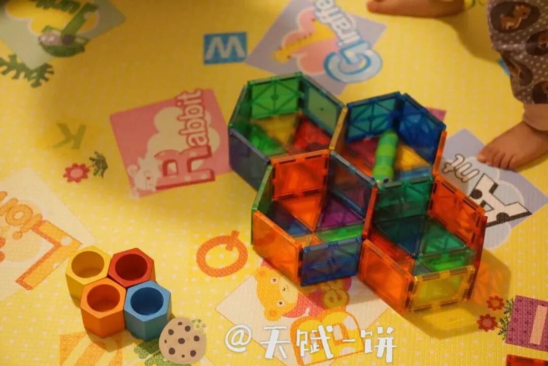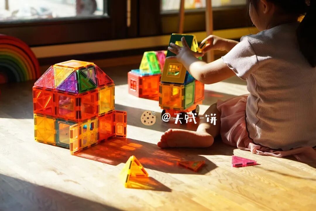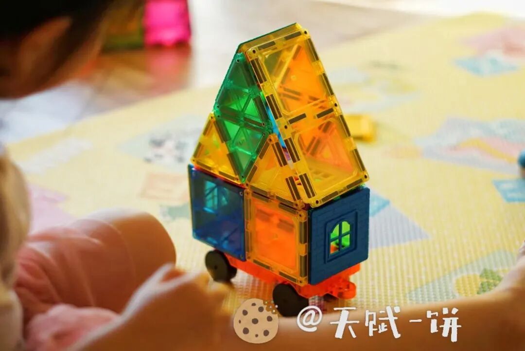 自由搭建大人搭建的思路是,先看到个啥或先想到个啥,然后用磁力片搭出来。而三四岁的娃正好反过来,先搭出来个东西,然后再想象这是个啥。如果你提议,咱们来搭个xxx吧,最后的结果大概率是,你搭,娃在一边加油。不如放下预设,抛开计划,让娃自由搭建,他们搭好再问ta这是啥,他们会更有兴趣,也更有信心玩。我们从1岁多开始玩彩窗磁力片,现在4岁多了,兴趣依然不减,常年放在玩具区,随时都可以玩。越大越会玩,越多越好玩,四五岁娃能玩的花样,已经不输给成年人了。你肯定觉得奇怪,之前Playmags团不了,为什么不选别的开团?彩窗磁力片那么多,看上去都美美的啊!饼饼1岁多的时候,我入了三套不同品牌的彩窗磁力片,混着玩。一套是国内很火的网红品牌,一套是恶贵的彩窗界天花板,还有一套就是今天开团的Playmags。说实话,新买的时候感觉都差不多,但玩了一段时间再对比,马上就有了伤害。恶贵的那个,好是真的好,贵是真的贵,一套可以买五套Playmags,价格实在是打扰了。(而且国内也没有正版授权渠道,所以不用想了)另一个国内网红品牌,说出名字你们肯定知道,但我不能说(赞我的求生欲),虽然价格很有竞争力,但品质上却差了一大截。性价比性价比,不是说便宜的就叫“性价比高”,同一价位的东西比性能,性能好的才叫性价比高。彩窗磁力片要做好玩几年的准备,性能很重要,不能图便宜。彩窗磁力片的”性能“,我主要看三点,透光性(耐磨性),磁力,稳定性。