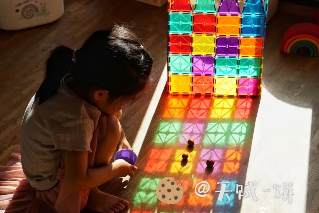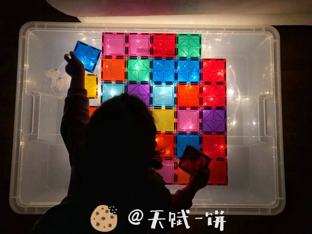 光影游戏冬天天黑早,我们傍晚关着灯,在灯箱上平铺彩窗磁力片。灯箱是我DIY的,宜家的最大号收纳箱,里面扔一个装电池的圣诞节灯带。等娃大了玩腻了,灯带可以用来装饰阳台,箱子可以收纳东西,还有比我更会过日子的博主吗。现在她可以拼复杂的立体造型了,太阳好的时候在窗户旁边玩,我都看得着迷了。