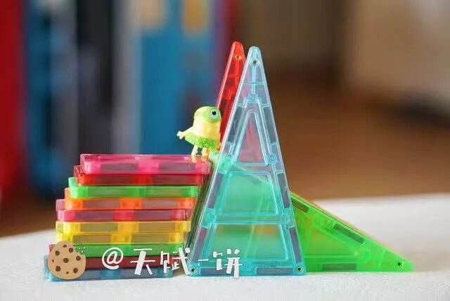 探索磁力和认知小娃不用期待用玩具搭出什么花样,ta们更感兴趣的是探索磁力片本身。你可以拿磁力片给ta们抓一抓,摸一摸,感知棱角和形状,同时跟ta们解释你看到了什么,摸到了什么,这是啥形状,啥颜色。你还可以带着娃一起探索磁力,两个磁力片靠近,啪地吸在一起,太神奇了!
