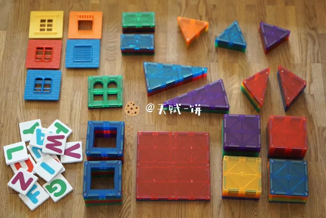 而Playmags今年开始做中国市场后,可以直接对接品牌方,没有中间商赚差价。公号渠道的首次团购,会过日子的小伙伴把价格压到了249元/套(含100个组件),比天猫双11低了不止一点半点儿。去年在亚马逊海淘的姐妹,不用难受,你家娃早玩了一年呢,而且一年前没有人知道他们今年会做中国市场,这个团价我也感到很意外。正好补个仓,拉低下均价,反正彩窗磁力片不嫌多,越多越好玩,越能发挥出娃的水平。近年来,彩窗磁力片的花样越来越多了,什么带轨道的,带声光电机关的,带遥控的,炫酷得很。我们玩了这么久,很清楚什么样的套装更实用,什么样的套装就是图个一时新鲜,什么样的可玩性强,什么样的比较鸡肋。我们玩得最多的、可玩性拓展性最强的就是基础套装,今天文章里的所有创意,都只用到了基础款的基础磁力片。Playmags的100件基础套装,其中包含82个不同形状的磁力片,13个字母方块(正反面共26个字母),5个窗户组件。![]()