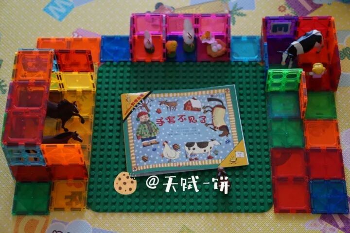 绘本拓展场景欧洲第一波疫情的时候,幼儿园关门,娃家里蹲了几个月。做《三只小猪》的绘本拓展,用到了彩窗磁力片搭房子,大彩虹做院子。做《手套不见了》的绘本拓展,用到了彩窗磁力片搭动物的家。