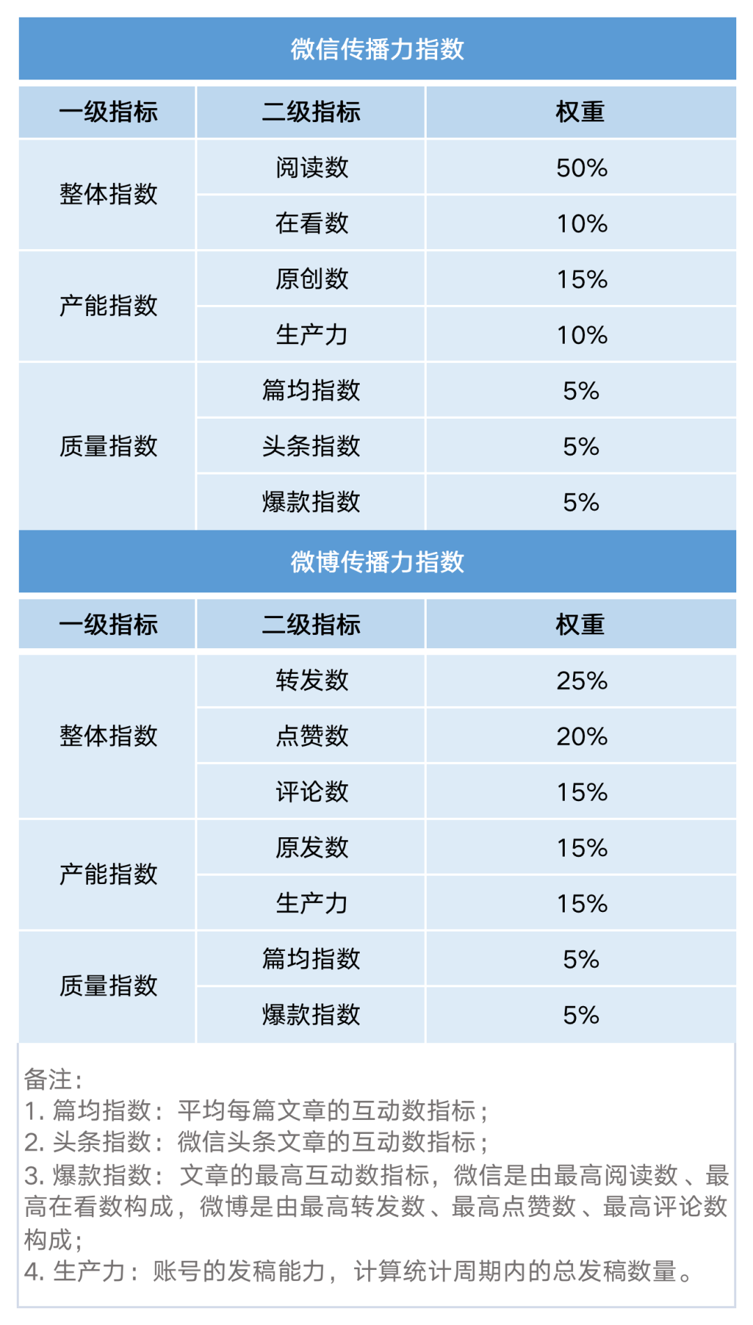 2.传播力指数由传播指数(阅读数、在看数、评论数、转发数等)、产能指数(文章数、原创数等)、质量指数(篇均指标、头条指标等)等构成。
