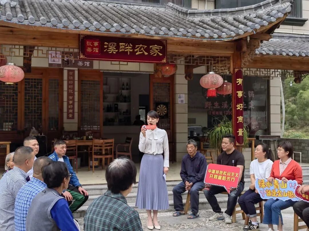 11月8日下午,在丽水莲都区黄村乡黄泥墩村,丽水开放大学施蕾芬教授,浙江开放大学吴乐珍副教授、博士,台州开放大学胡燕副教授,浙江省“00 talker”宣讲团成员、丽水开放大学青年学生程萱烨,同讲“一堂课”,给村民们宣讲党的二十大精神。