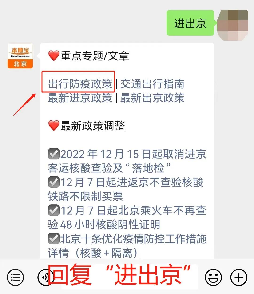 点击下方名片,关注【北京本地宝】在后台聊天对话框回复【进出京】,可进入出行防疫政策查询。