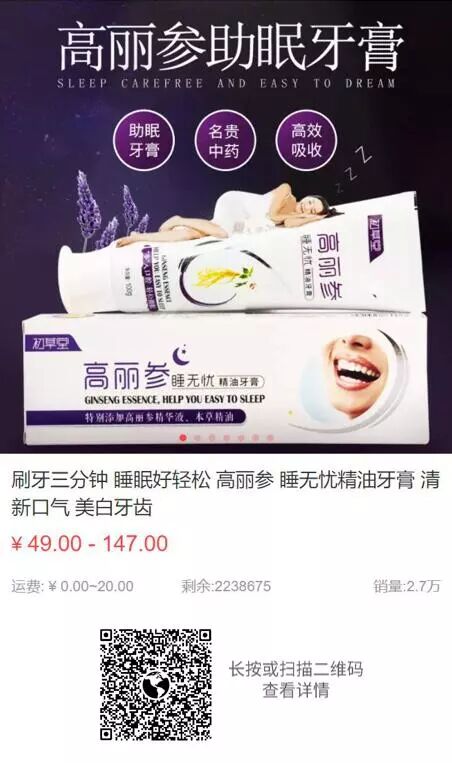 睡无忧精油牙膏通过口腔给”药“的方式,能最大程度保留人参的有效成分,刷牙时,人参精华液滋润着每个口腔细胞,直达脑神经中枢,当即感到宁心安神,催眠静心,莫名舒心,很多人刷完没一会就犯困了。