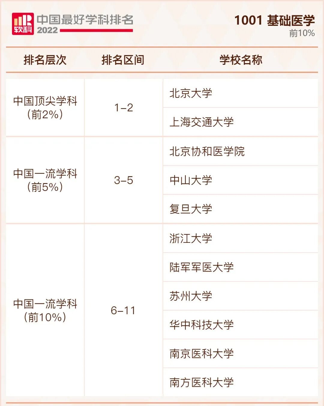 基础医学学科排名前10%的高校: