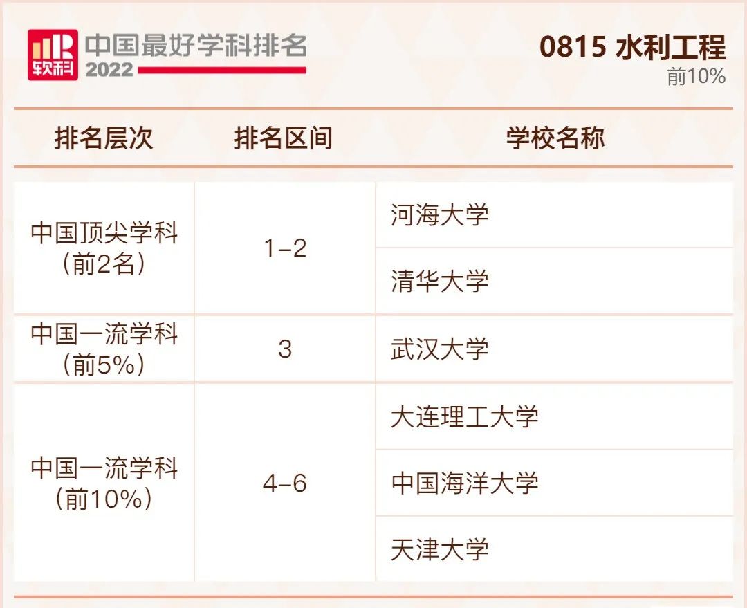 水利工程学科排名前10%的高校: