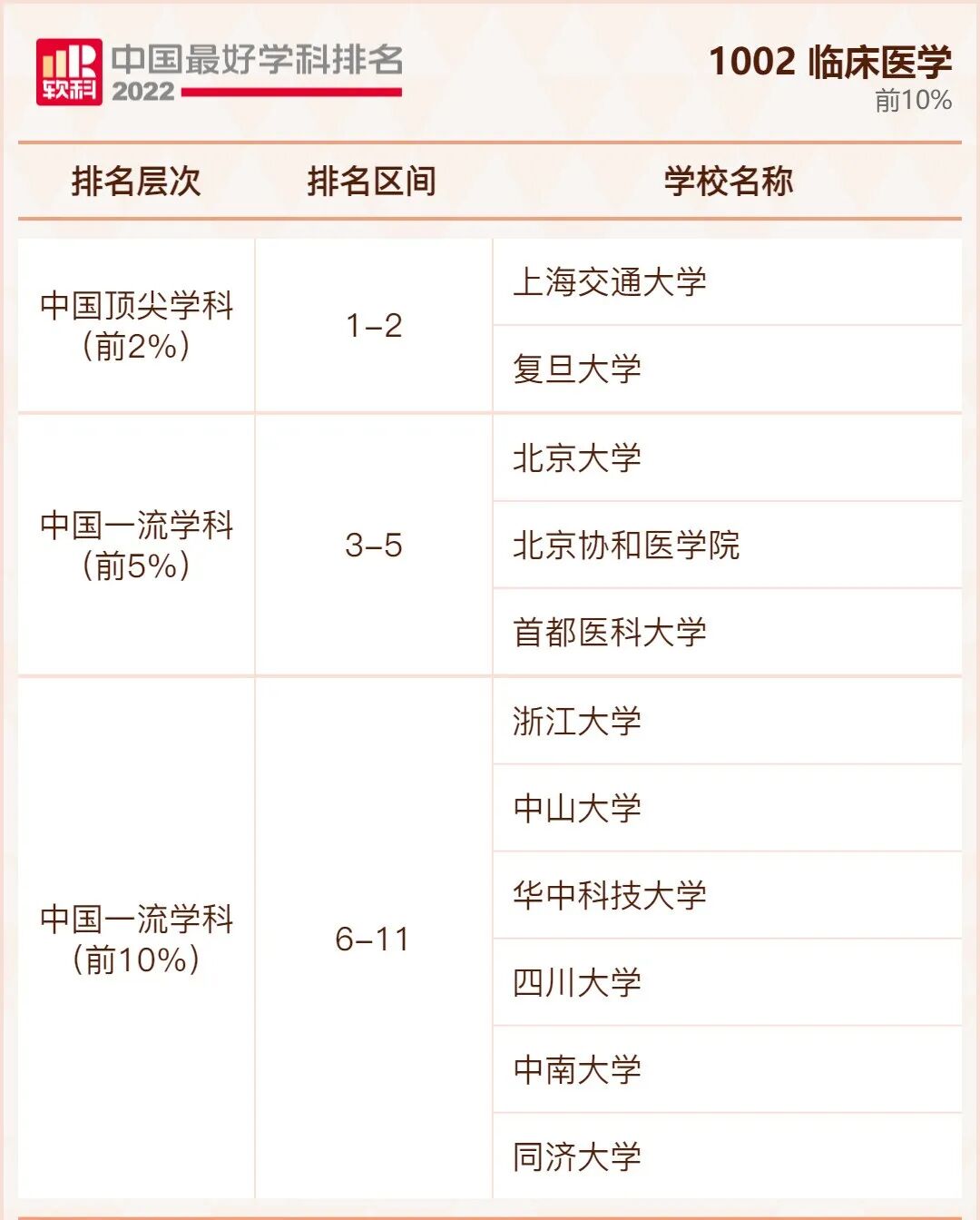 临床医学学科排名前10%的高校: