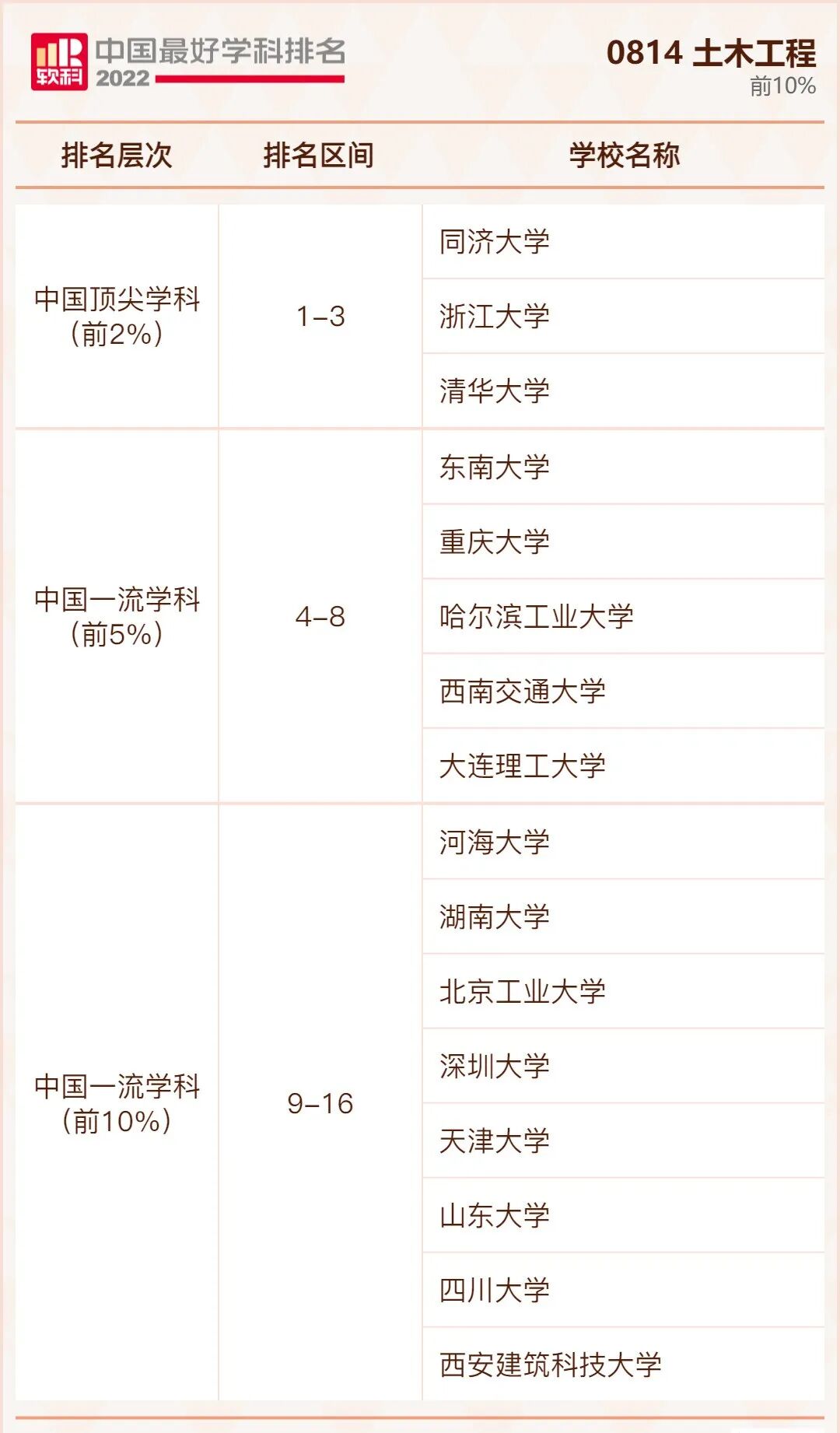 土木工程学科排名前10%的高校: