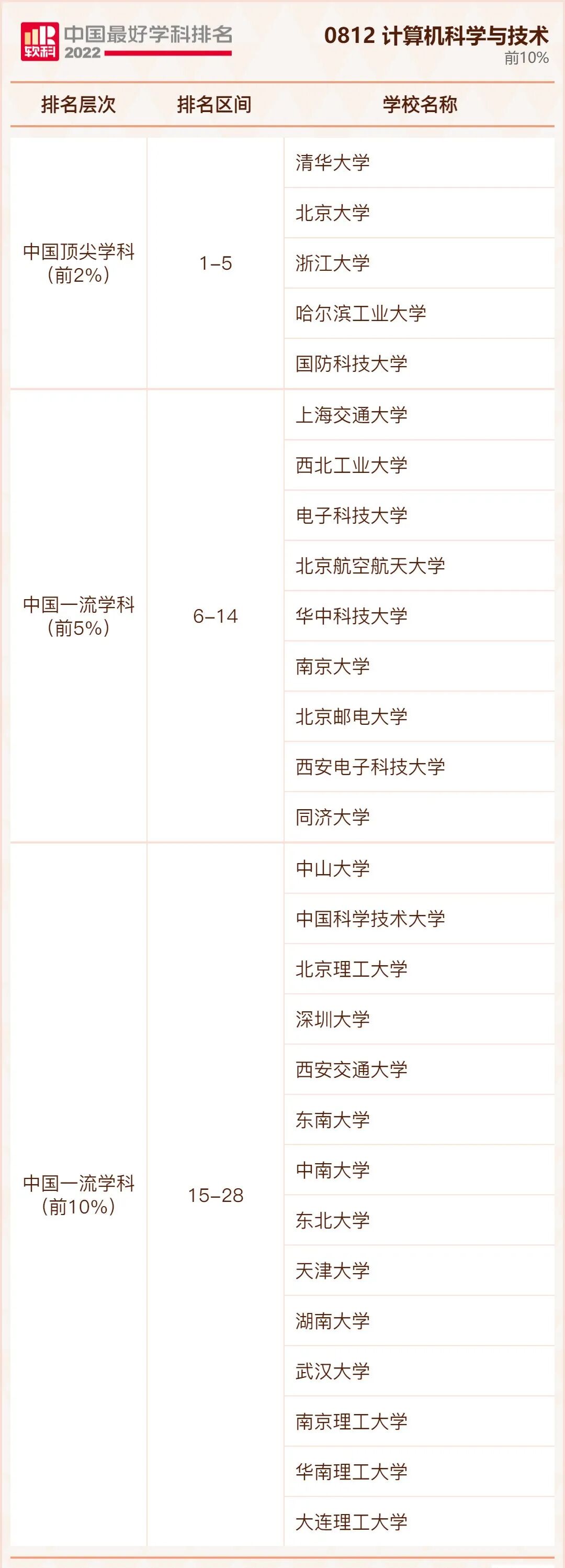 计算机科学与技术学科排名前10%的高校: