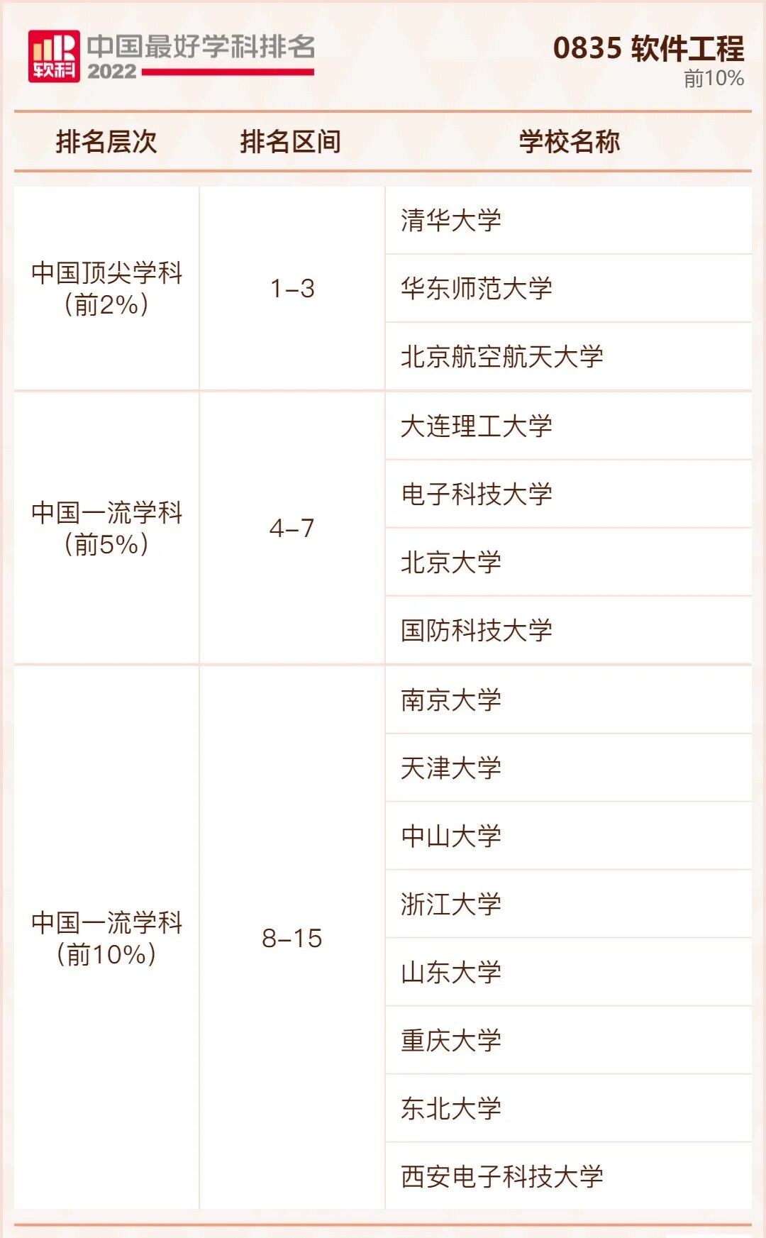 软件工程学科排名前10%的高校: