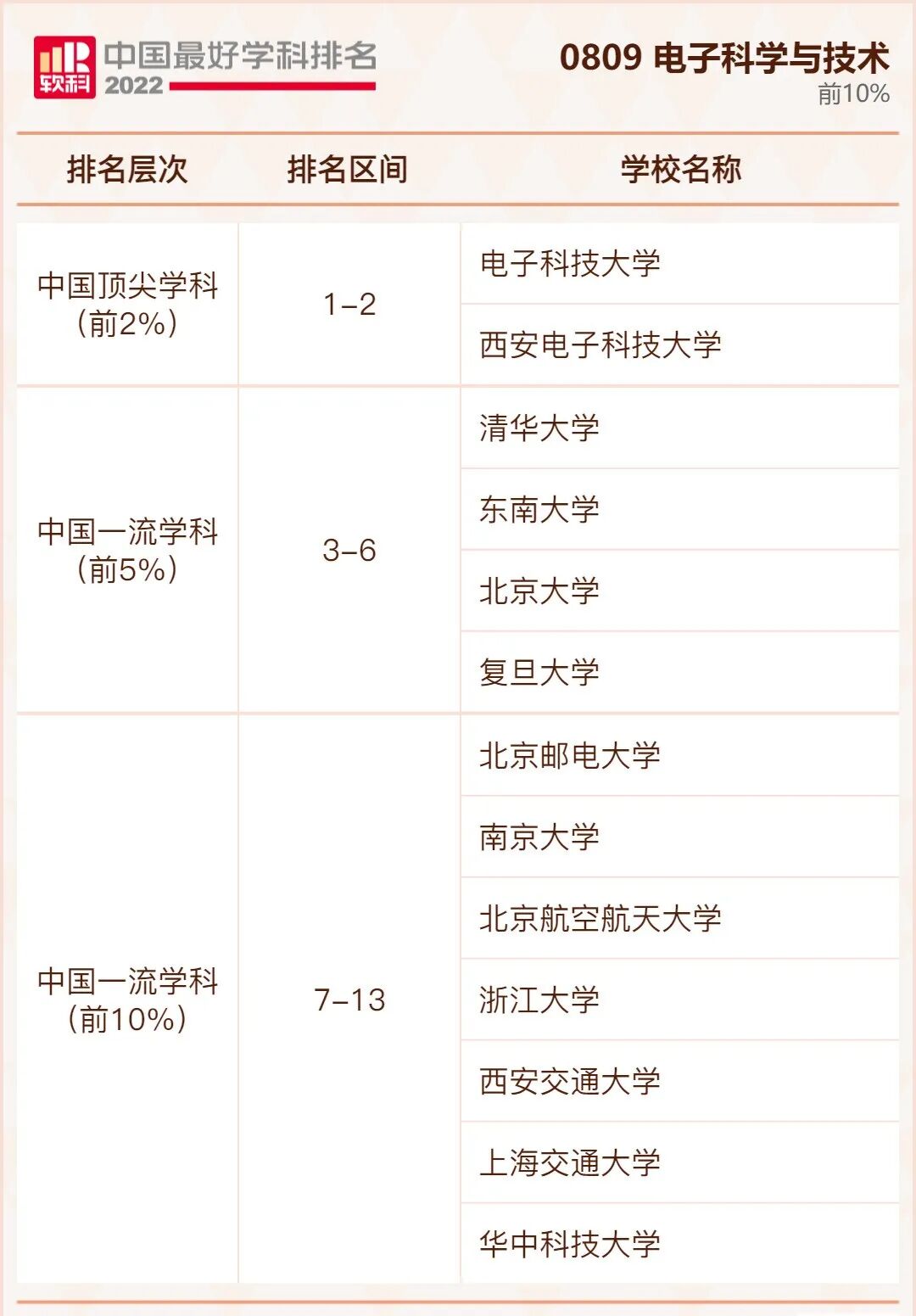 电子科学与技术学科排名前10%的高校: