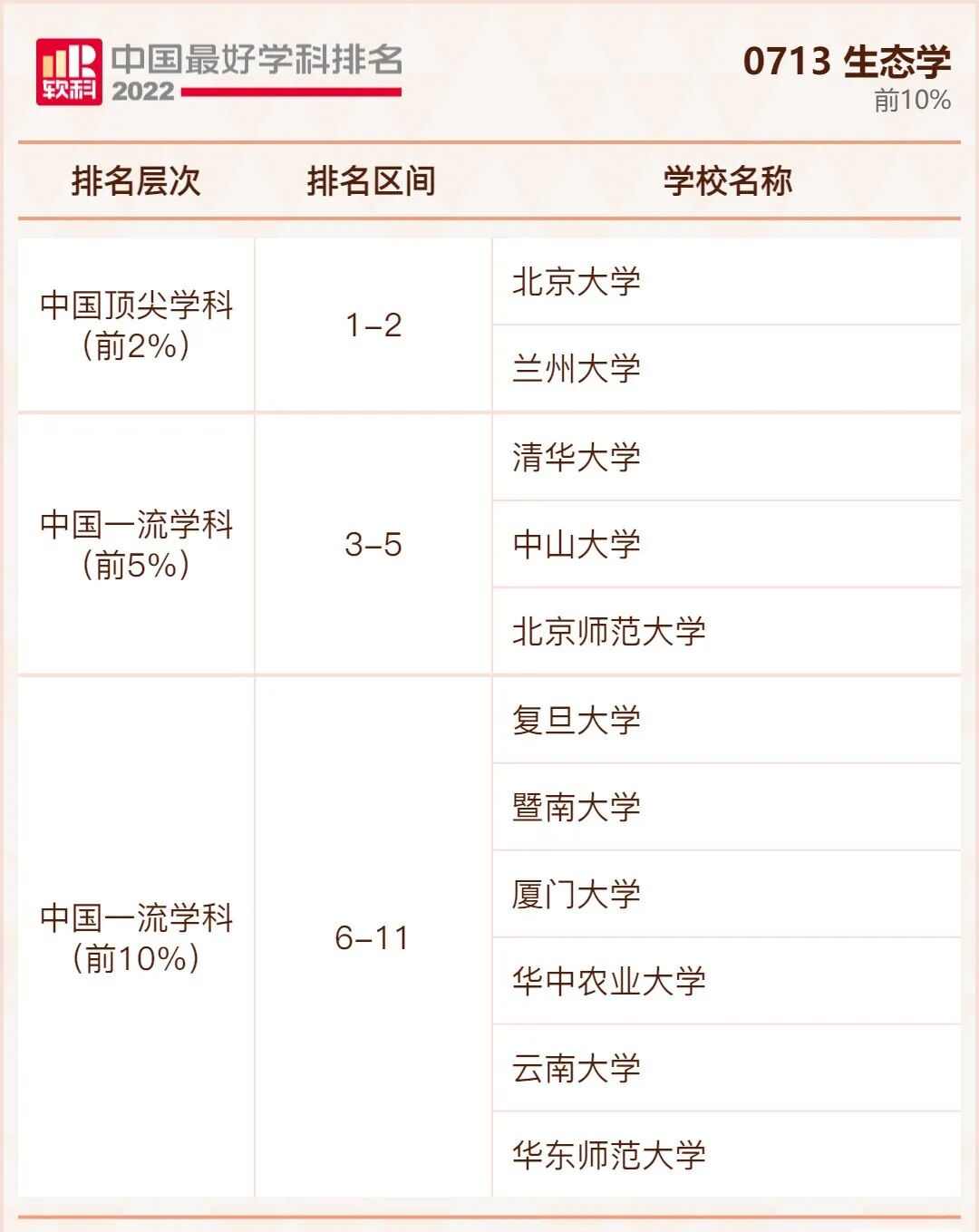 生态学学科排名前10%的高校: