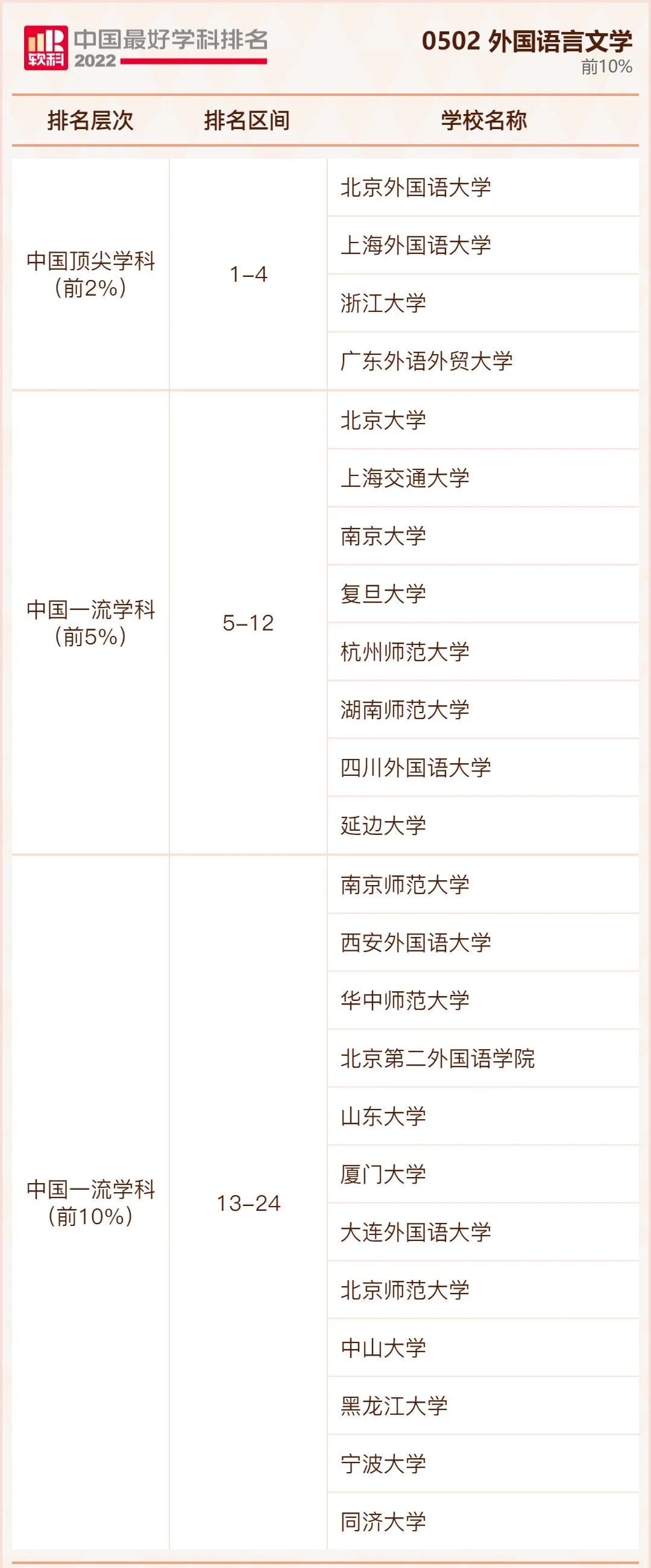 外国语言文学学科排名前10%的高校: