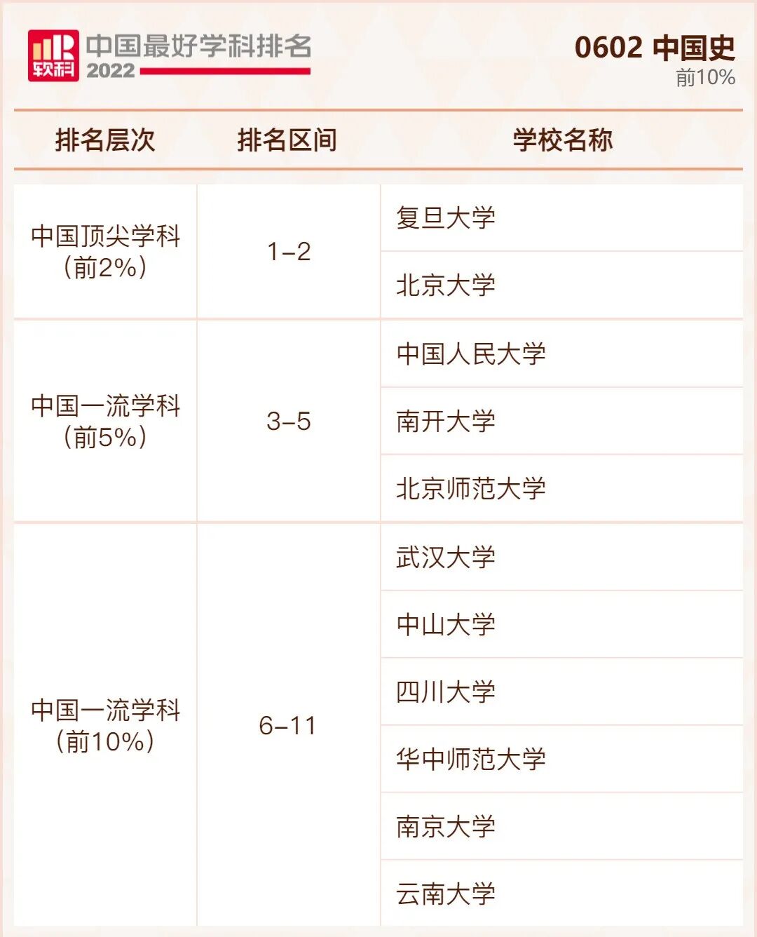 中国史学科排名前10%的高校:
