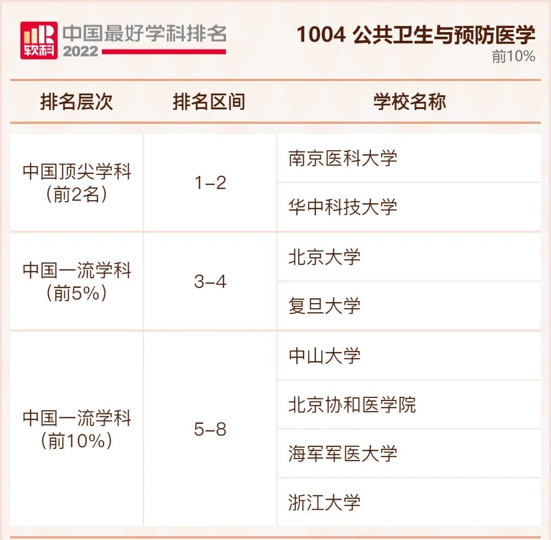公共卫生与预防医学学科排名前10%的高校: