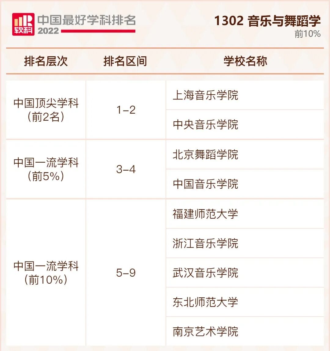 音乐与舞蹈学学科排名前10%的高校: