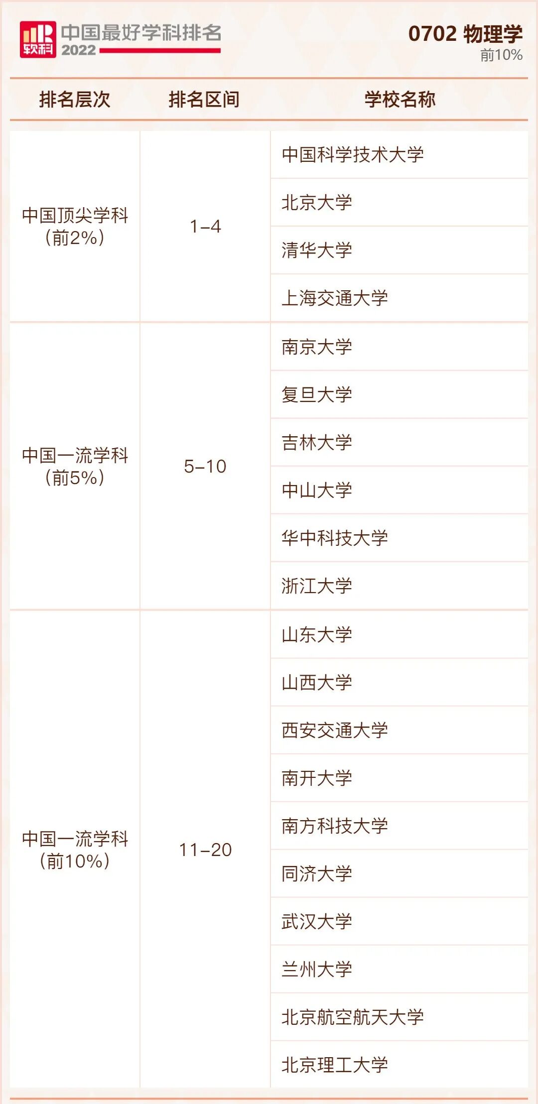物理学学科排名前10%的高校:
