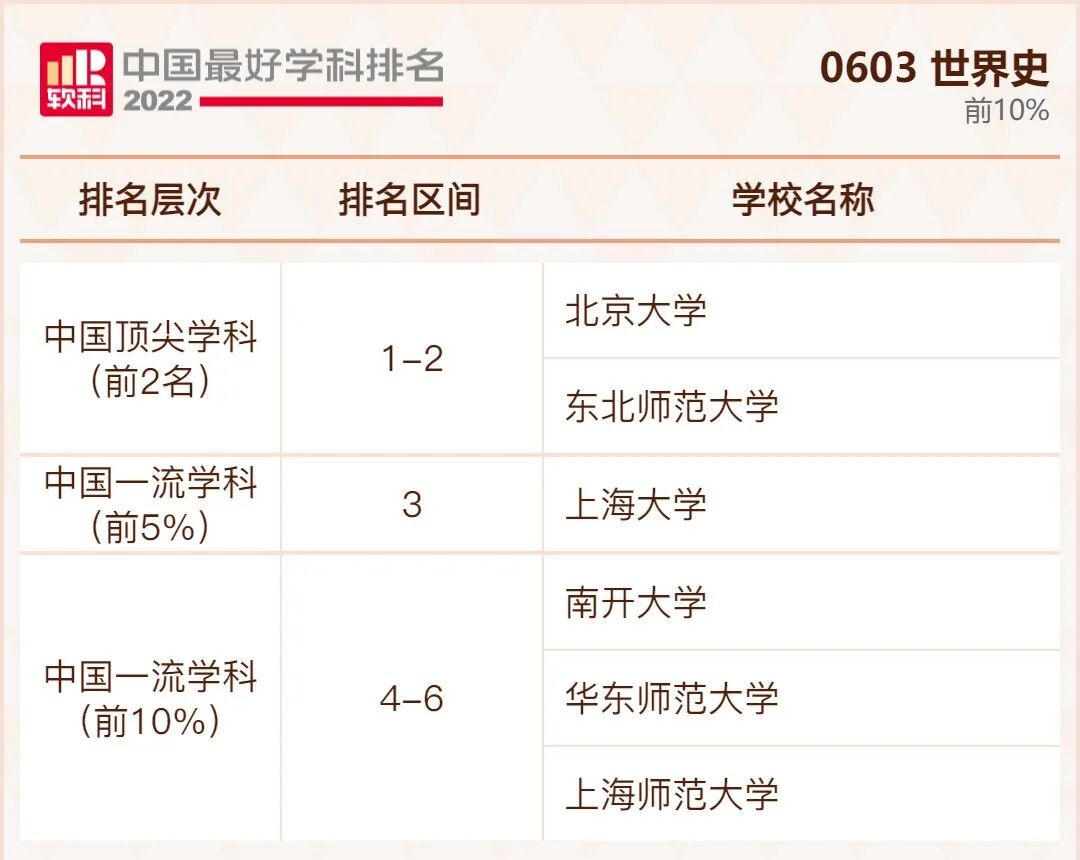 世界史学科排名前10%的高校: