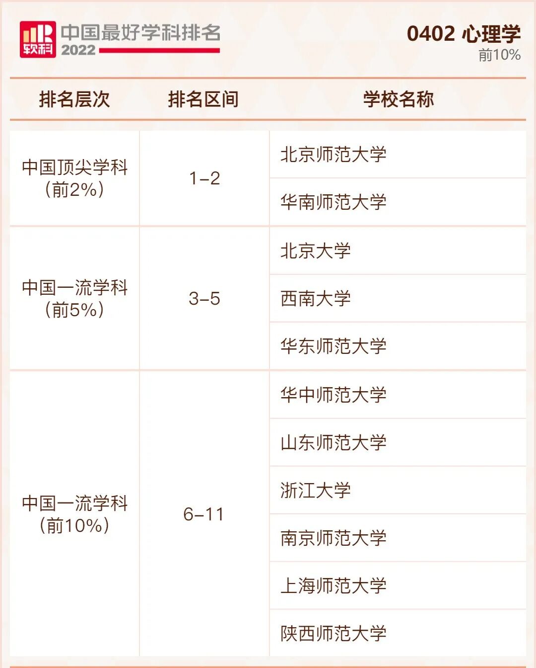 心理学学科排名前10%的高校: