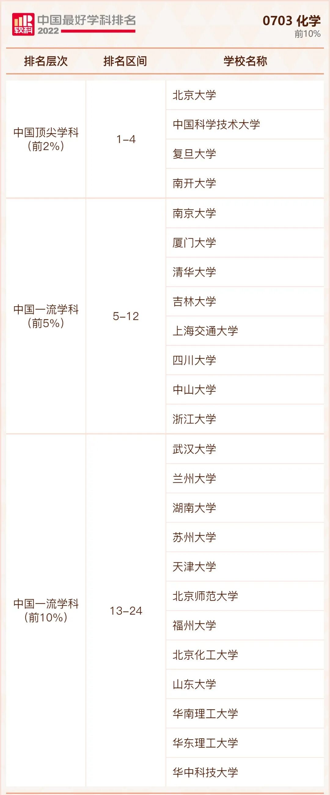 化学学科排名前10%的高校: