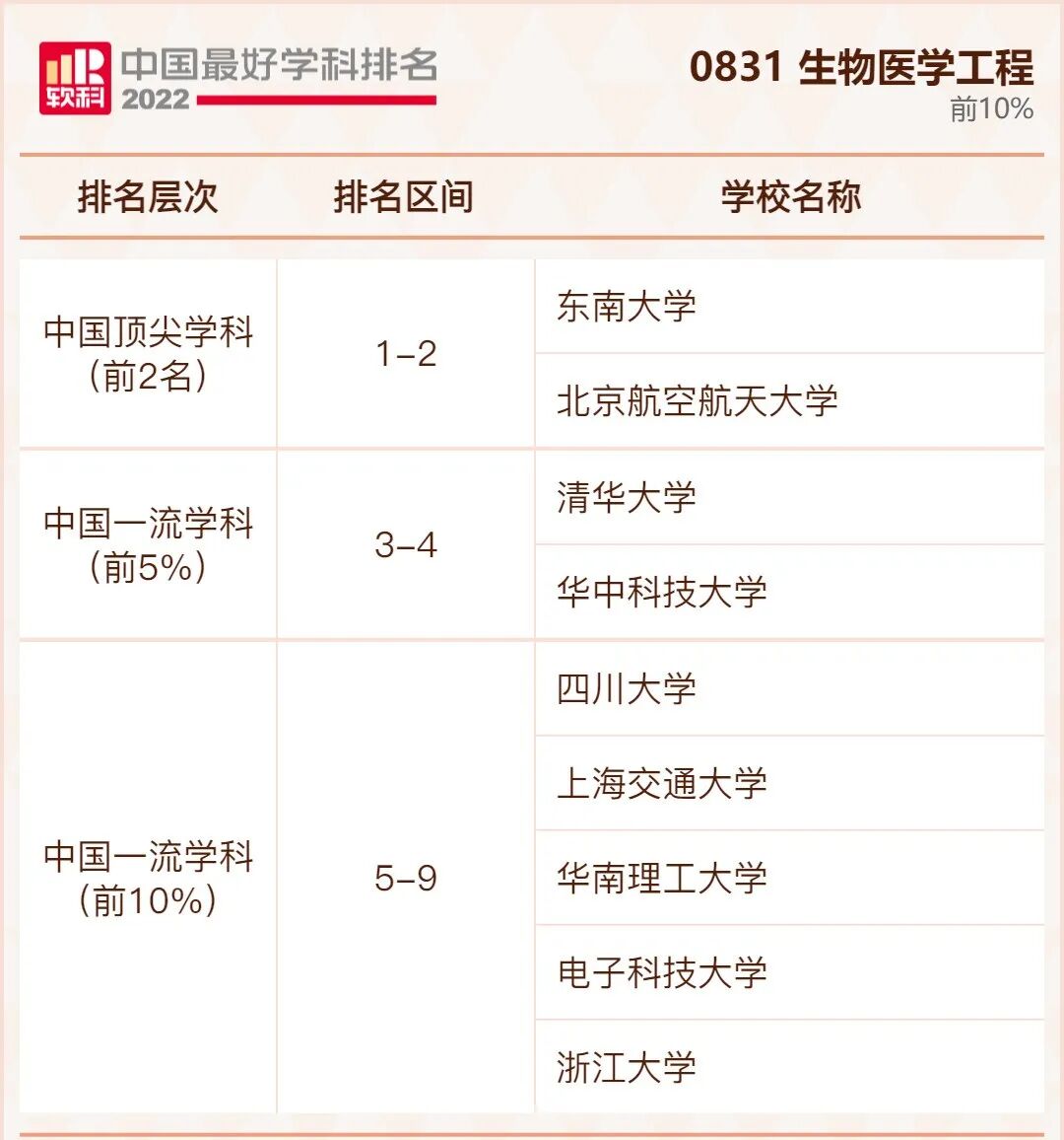 生物学学科排名前10%的高校: