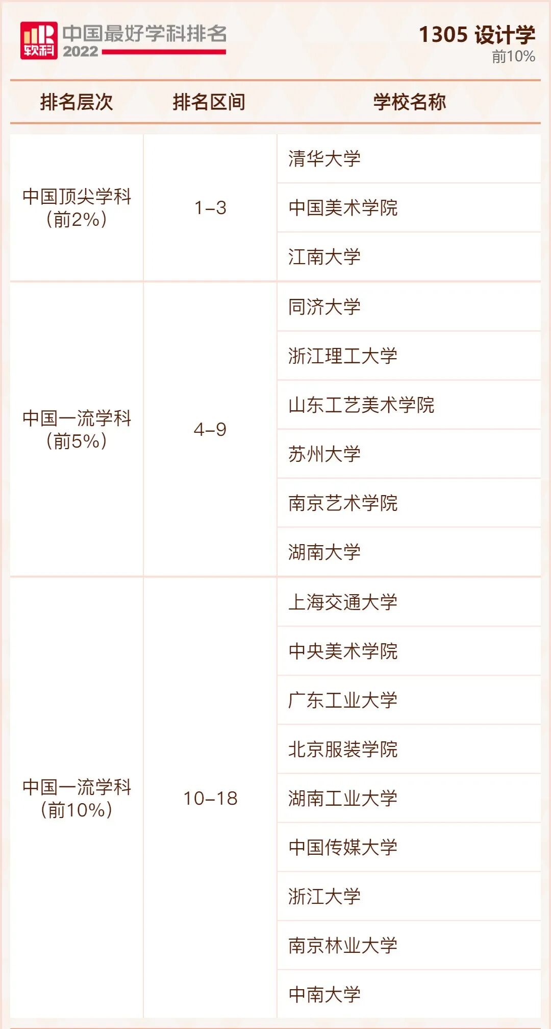 设计学学科排名前10%的高校: