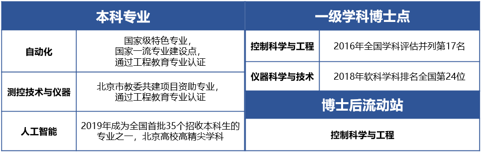 目前,学院拥有5个教学机构和5个研究机构,下设自动化、测控技术与仪器、人工智能3个本科专业,控制科学与工程、仪器科学与技术2个一级学科博士点和控制科学与工程1个博士后流动站。