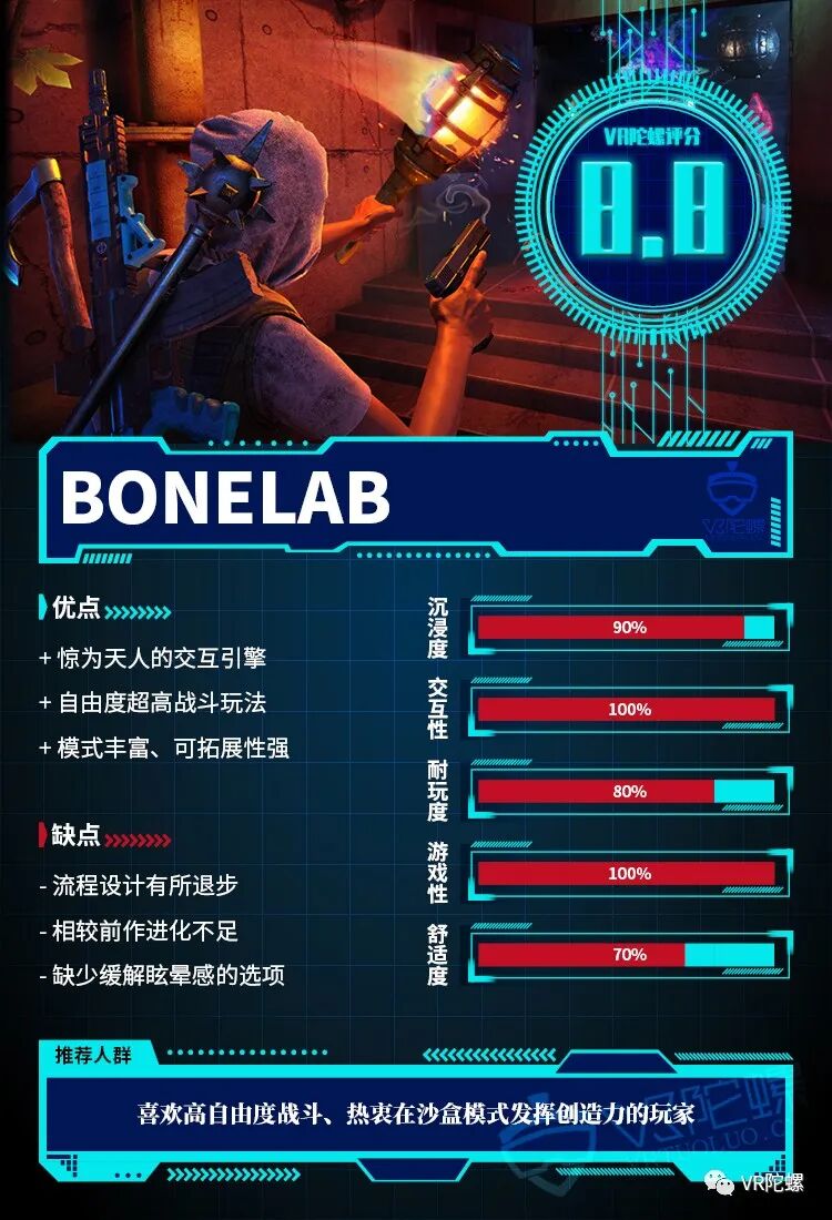 就《BONELAB》本身的素质而言,评价理应比Steam的分数更高一些。毫不夸张地说,单单是“1 Marrow交互引擎”所能实现的内容就已经值8分了。现阶段差评的原因是来自于多方面的:
