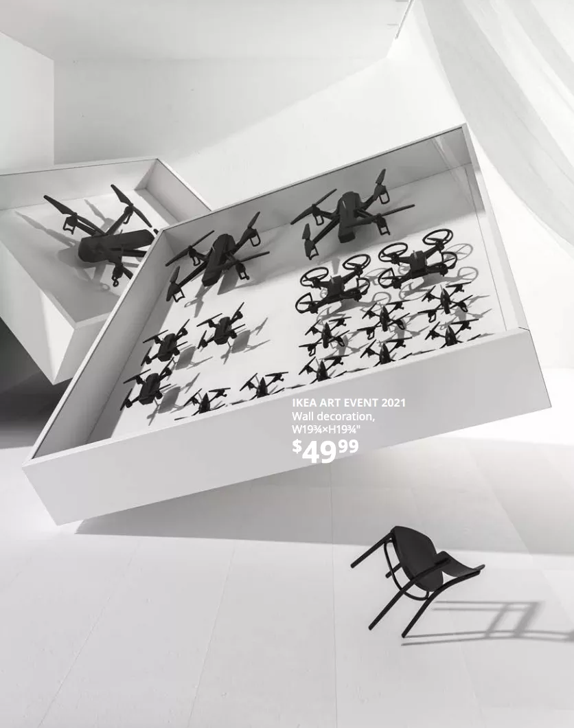 在此次 IKEA Art Event 中,他们打造了两款墙上装饰,设计的灵感来自蝴蝶标本陈列柜,但把蝴蝶换成了无人机,隐含着对科技与自然关系的思考。也许就像创始人想传达的一样:「设计时太过于执着功能性,反而会让设计与艺术产生界限,我们想做的是触动人们情绪。」