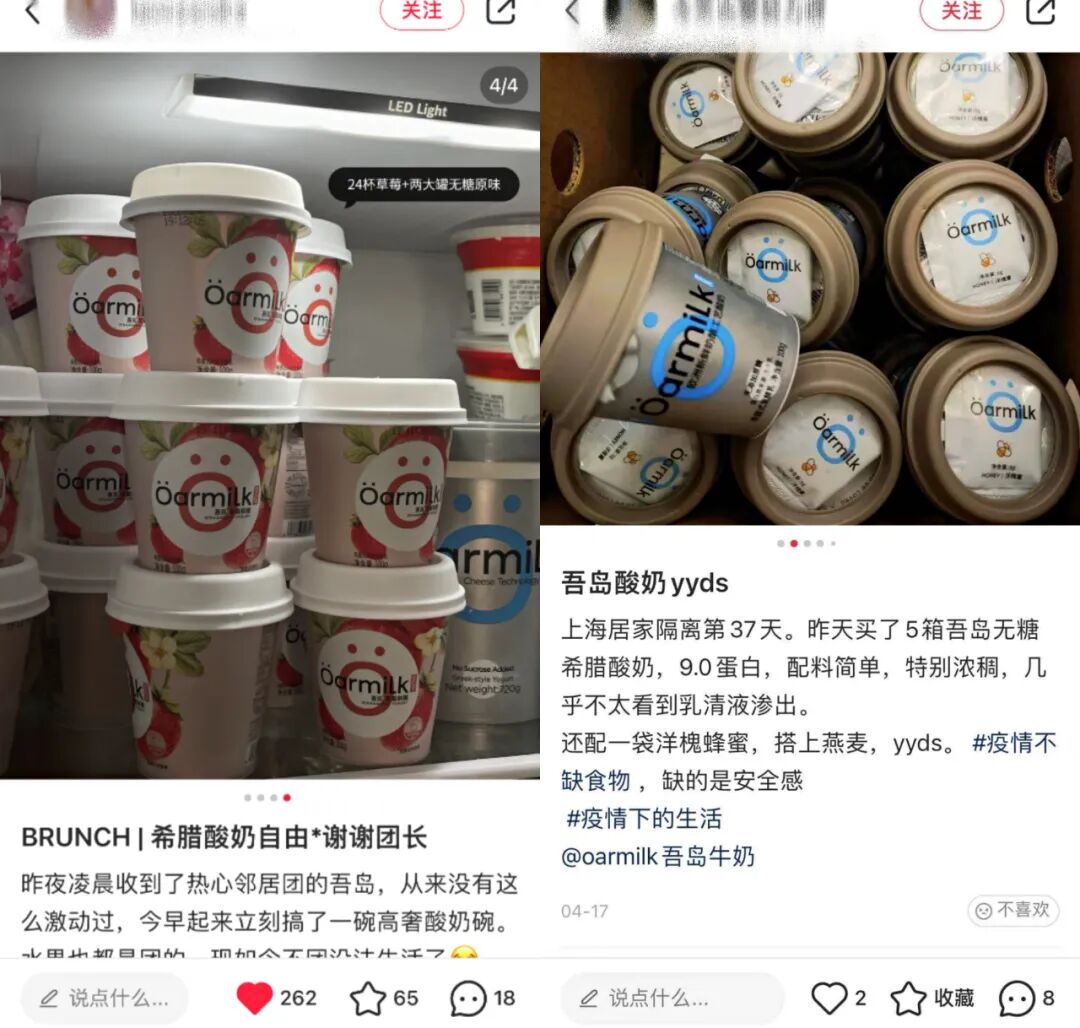 而超出吾岛预期的是,这次社区团购持续吸纳着越来越多的新用户,更多人通过社群团购到产品,了解到了吾岛这个品牌。截至 4 月 21 日,吾岛已向上海运送 3000 多箱乳品物资,用户在小红书等主流公域媒体自发输出产品反馈,公域流量的加持助推品牌进一步破圈。