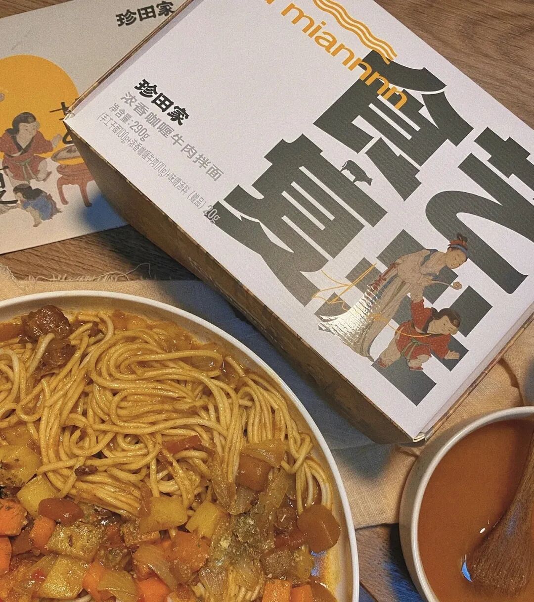 「珍田家」是创立于 2020 年 9 月的全新速食品牌,品牌以速食面作为市场切入口,目前推出了麻酱花椒拌面、浓香咖喱牛肉面等多种口味,「食艺复兴」是珍田家的品牌 slogan,也表达着品牌坚持向消费者传递“美食就是艺术”的观点。