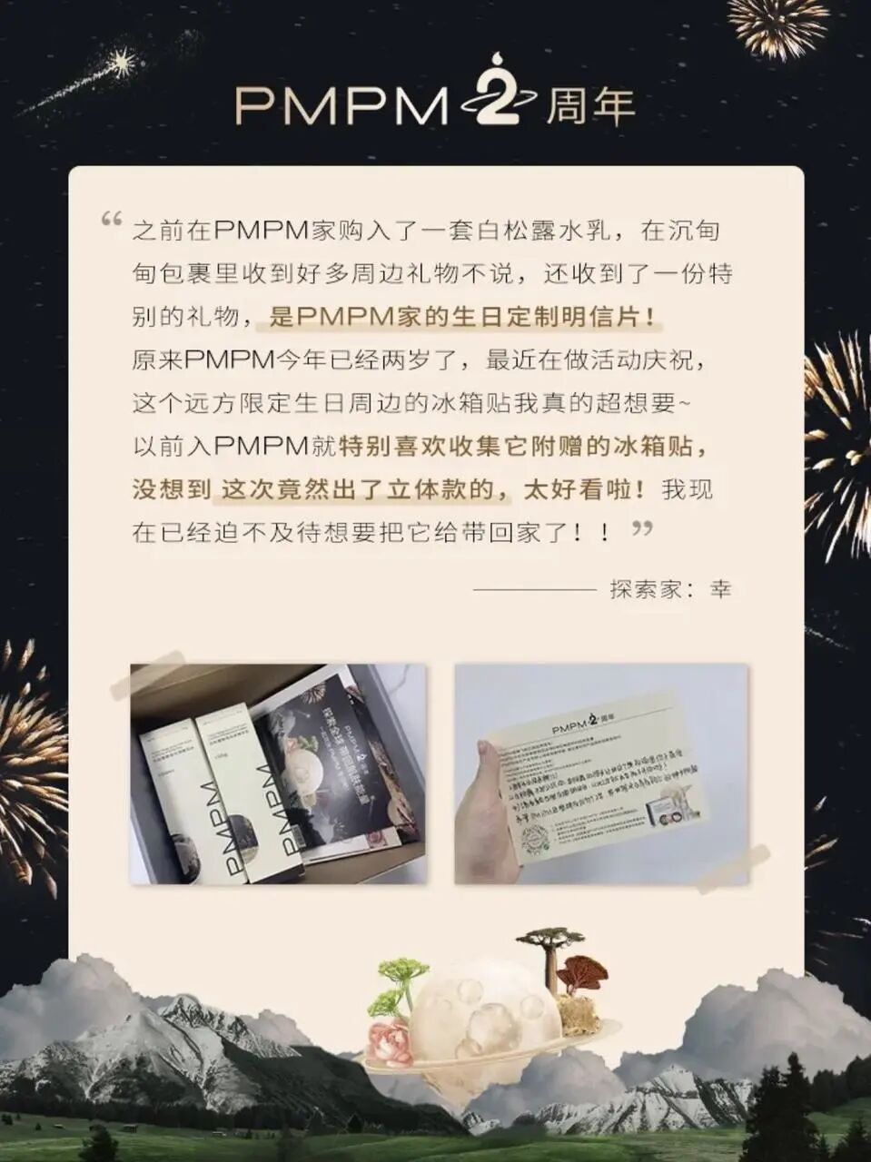 两周年活动期间,PMPM 邀请用户在随产品寄送的空白明信片中写下生日祝福,并发起带话题晒图集赞活动,并邀请用户将对 PMPM 的生日祝福语音发送至品牌邮箱。对部分参与活动的用户,PMPM 将寄送出回礼。
