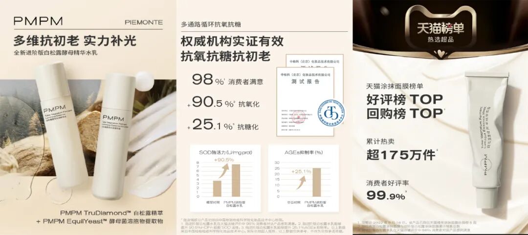 在功效检测层面,自 2022 年 1 月 1 日,化妆品行业新规正式实施。新规要求,化妆品应当开展人体功效评价试验,并且化妆品备案需要提交产品安全评估资料。PMPM从成立之初便与代表国内化妆品功效检测最高水平的中国检科院合作,检测范围全面覆盖细胞测试、皮肤模型及临床测试 ,从多维度证实产品功效 。以“只做能被验证的功效”为准则,PMPM 产品所宣称的每个功效都有对应的权威功效报告,仅白松露系列就拥有 84 份功效检测报告。除合作外,PMPM 自去年底开始投入上千万资金,建设自有功效检测评估中心,将于今年投入使用。据了解,该中心已有在化妆品功效评价领域有着十余年经验的廖峰博士加入,将会帮助 PMPM 在原料、产品安全与功效评估等维度进一步夯实产品实力。