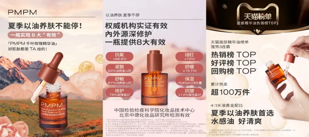 另一千叶玫瑰系列则主要针对敏感肌。后疫情时代,“口罩脸”成为消费者关注的护肤问题,泛敏感肌用户对舒缓修复的需求也日益增多。并且,年轻肌肤用户中油性肤质的比例逐步上升,而一些纯油类产品的肤感对大部分年轻肌肤用户而言,未必是适合的日常护肤产品。PMPM 洞察到了当下不同敏感肌肤质人群对轻盈的水感精华油的迫切需求,推出了采用了4:1水油配比的千叶玫瑰精华油,来帮助这部分用户完成肌肤的舒缓和保湿。目前 PMPM 千叶玫瑰精华油的用户超半数为 18-25 岁的消费者,消费者满意度高达 99.6%,该系列至今销量已超 100 万瓶。