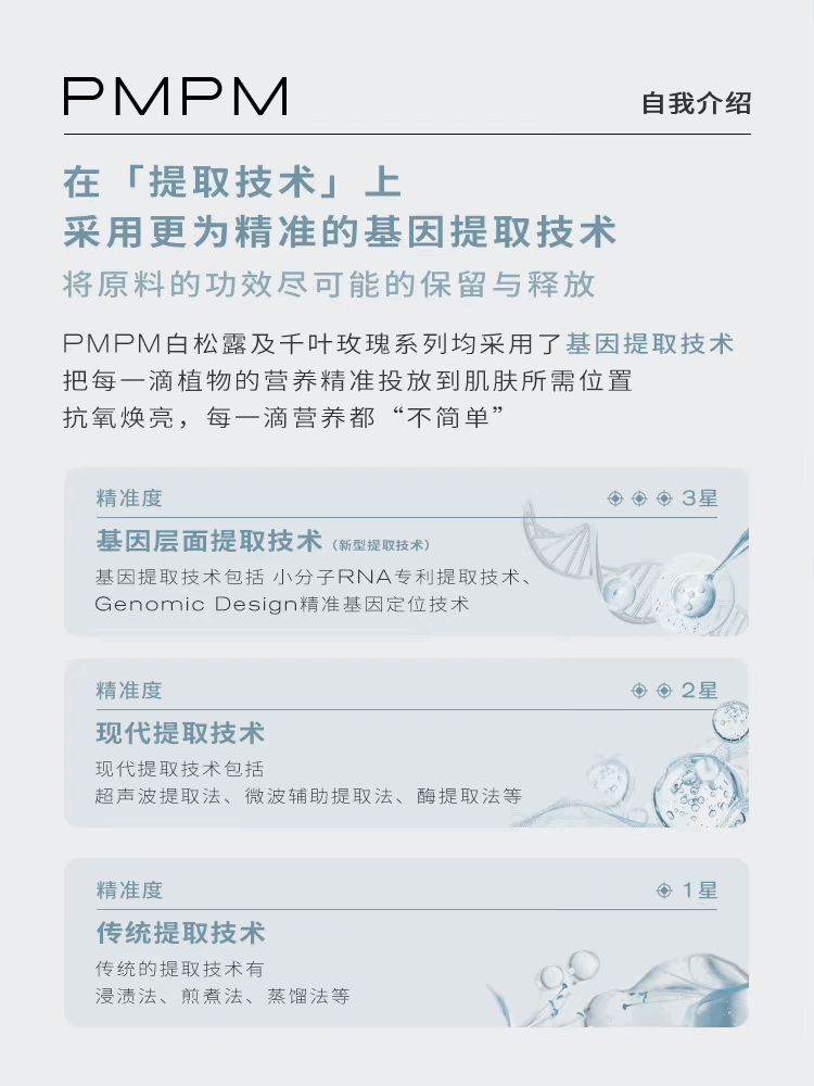 为增强在原料端的竞争力,PMPM 先后与全球顶级原料供应商亚什兰、江南大学化妆品创新中心达成战略合作,联合进行独家原料的创新研发。目前,PMPM 与各方的合作已初见成果,以旗下白松露系列为例,其中主打内外源抗初老的 TruDiamond™ 白松露精萃就是与亚什兰合作研发的,抵抗肌肤糖化及肌肤黑色素合成的 EquilYeast™ 酵母菌溶胞物提取物则是与江南大学化妆品创新中心共创而成。而且,在研发这些独家原料时,PMPM 采用了国际尖端专利的独家基因提取技术,包括小分子 RNA 专利提取技术和Genomic Design 精准基因定位技术。