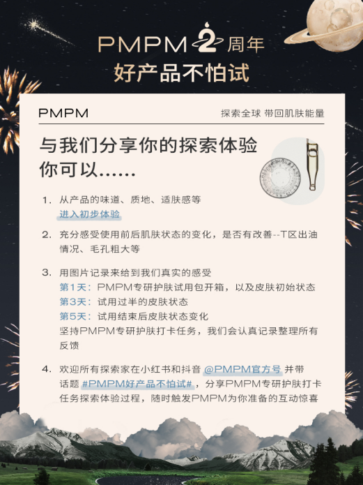 与 PMPM 在此次两周年活动中强调产品功效相呼应的是,PMPM 围绕产品功效推出了「好产品不怕试」活动。邀请 5000 名有油性或者混油性肌肤问题的用户试用 PMPM 海糖精华控油水乳,并希望用户反馈皮肤状态的图片记录与使用感受。