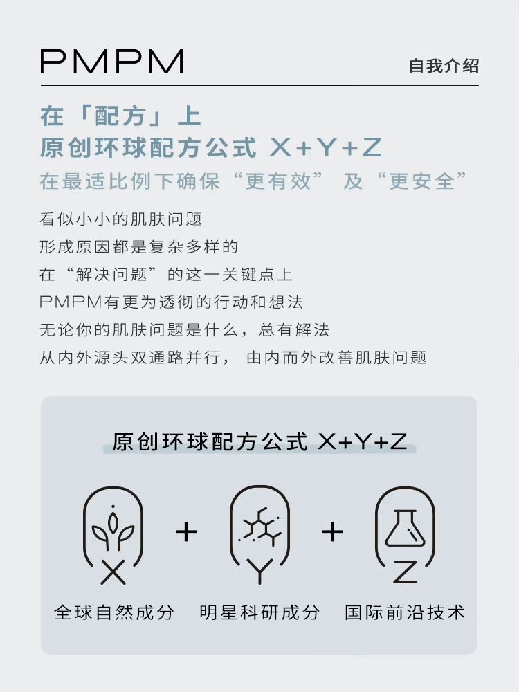 在配方上,PMPM 从创立之初,就一直坚持其原创环球配方公式“X+Y+Z”,即“全球自然成分+明星科研成分+国际前沿技术”,通过将合适的天然成分与科研成分在“最适比例”之下进行复配,去实现 1+1>2 的效果。作为新锐护肤品牌,PMPM 通过自研核心配方,来打造品牌差异化。