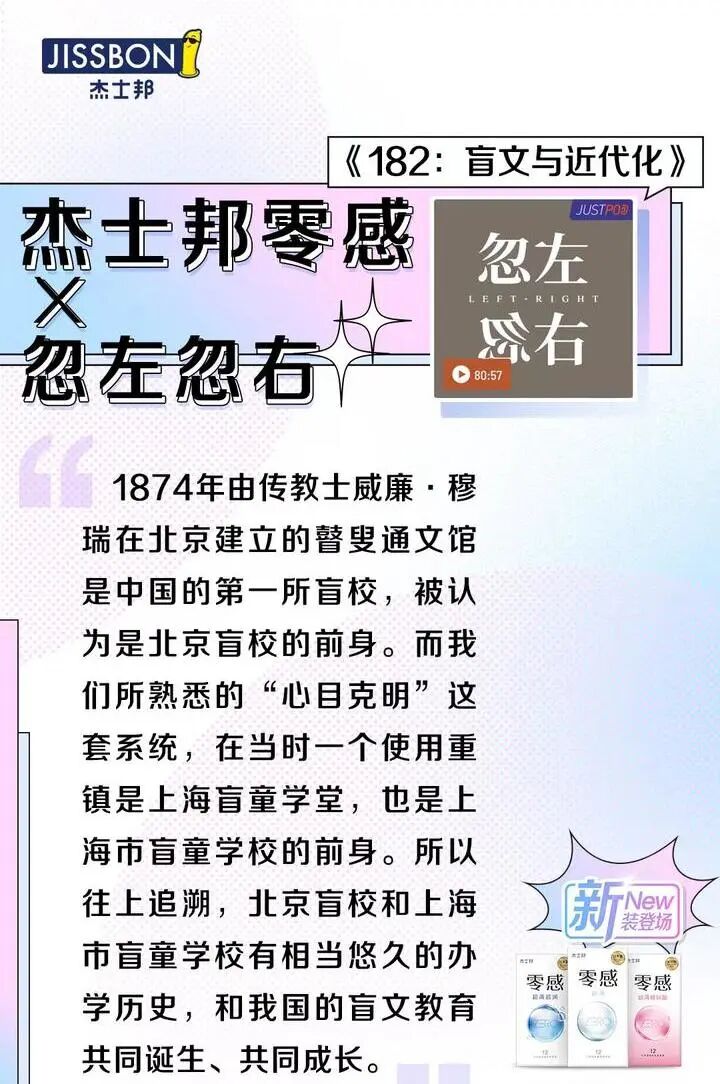 内容上我们比较倾向由播客主理人来自由发挥,沟通主题后,由他们根据播客的调性做自主选题,然后跟我们共创。比如忽左忽右,是一档文化沙龙类播客节目,曾获苹果播客 2019 年度最佳播客。那一期播客探讨的是“盲文和近代化”,它对中国盲文的发展进行讲解,包括中国历史上第一套盲文“康熙盲字”,还有后来基于南方光官话系统的“心目克明”盲文体系。这样的合作也拓宽了我们的知识面。