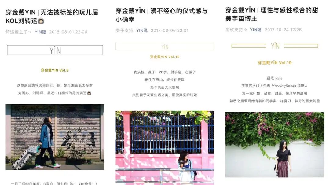品牌成立初期,YIN 隐的公众号里开设了一个栏目——「穿金戴 YIN」。在这个栏目中,YIN 隐会从品牌社群里挖掘一些有趣的用户,邀请他们分享自己的生活状态以及他们所代表的生活方式。他们所表达出来的内容,也与 YIN 隐倡导的“自我又不失趣味”的品牌理念所契合。这个有点像图文版播客的专栏,被 Ayur 视作品牌播客的前身。