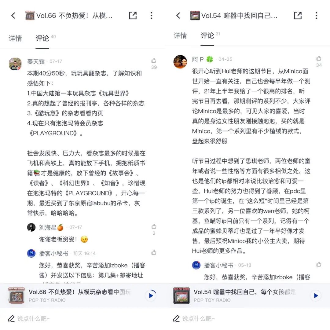 资深娃友阿 P、沙拉、姜天霆是《POP TOY RADIO》的忠实听众,每逢更新都会在评论区写下“小作文”,由此也被海星邀请来录制了一期对谈节目。让海星出乎意料的是,他们之前并没有收听播客的习惯,直到现在也就听 POP TOY RADIO 这一个播客,并且他们都认为,坚持收听《POP TOY RADIO》是因为对潮玩的热爱,和对播客内容的认可。