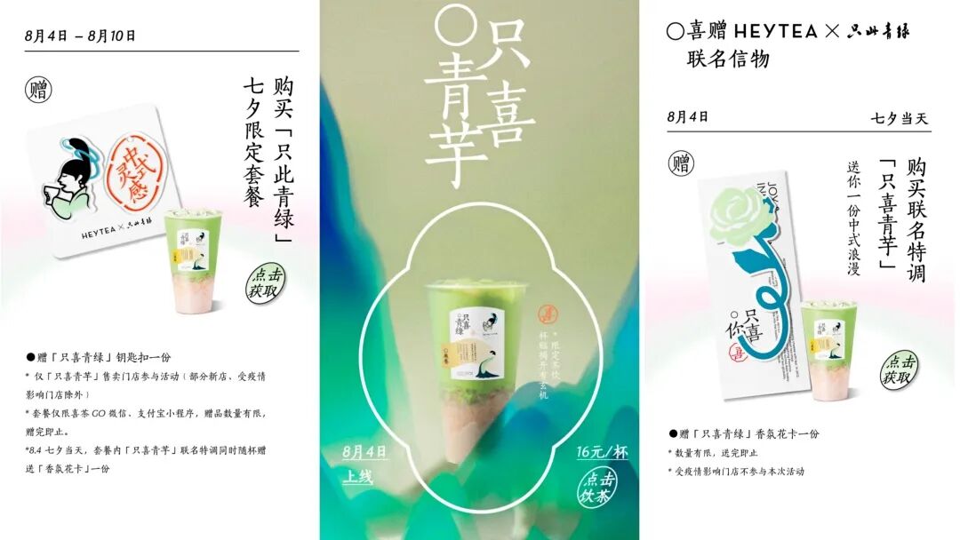 想要戳中见多识广的消费者的心巴,只有茶饮肯定不够。除了常规操作的联名杯套和手提卡纸袋,深谙此理的喜茶在今天上线联名香氛花卡,只送不卖,拿捏住了。只有一天的活动难免被指责饥饿营销,8 月 4 日至 8 月 10 日,喜茶推出“只此青绿”七夕限定套餐,附赠钥匙扣一只,同款限定喜卡可供充值。