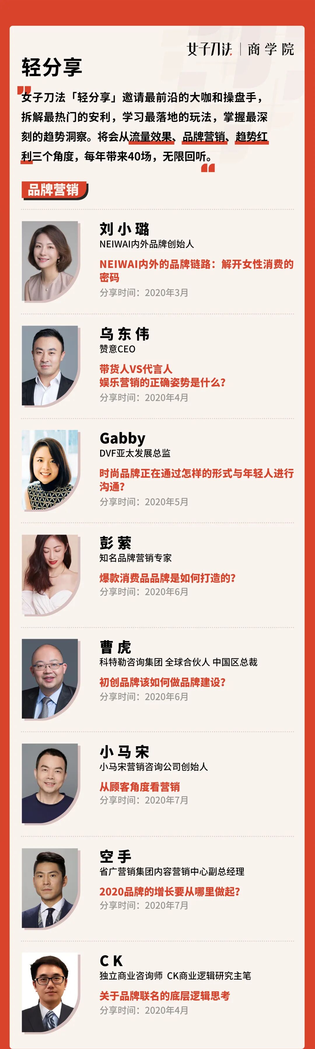 女子刀法「轻分享」邀请最前沿的大咖和操盘手,拆解最热门的案例,学习最落地的玩法,掌握最深刻的趋势洞察。将会从流量效果、品牌营销、趋势红利三个角度,每年带来40场直播,无限回听。
