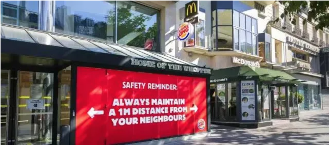 还有法国汉堡王,这段时间受疫情影响门店只做外卖,但它也没让门口位置闲着。居然投放一支广告diss麦当劳:总是要与你的邻居保持一米距离。