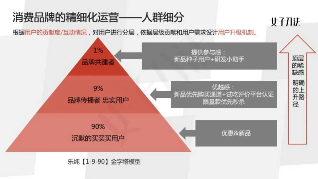 之后,再为每个层级用户设置上升通路。同时还要保持稀缺感,顶层需要申请制,有限量名额,大家会觉得有一种很稀缺的感觉。