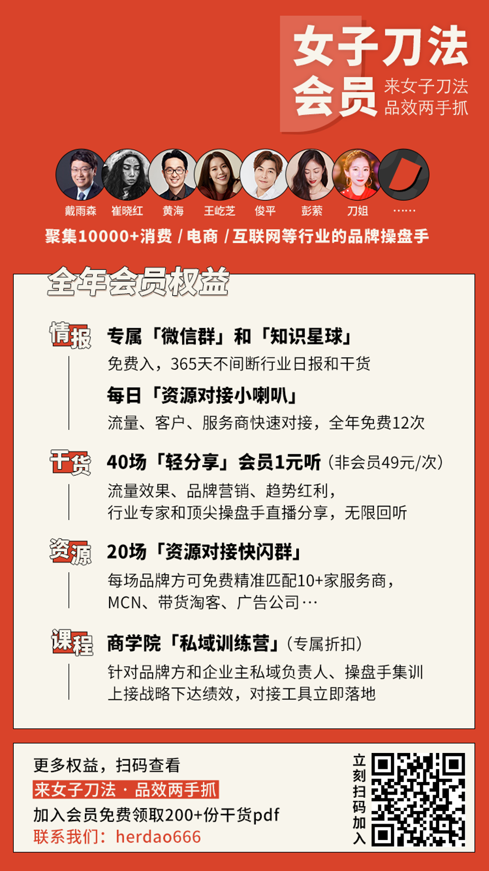 当然,成为女子刀法会员还能享受更多额外权益,包括「高质量的行业信息交流」「优质的人脉操盘手网络」「精准的行业资源对接」和「体系化的营销方法论」,欢迎长按识别下方二维码或点击阅读原文,加入10000+品牌操盘手的新营销行业俱乐部