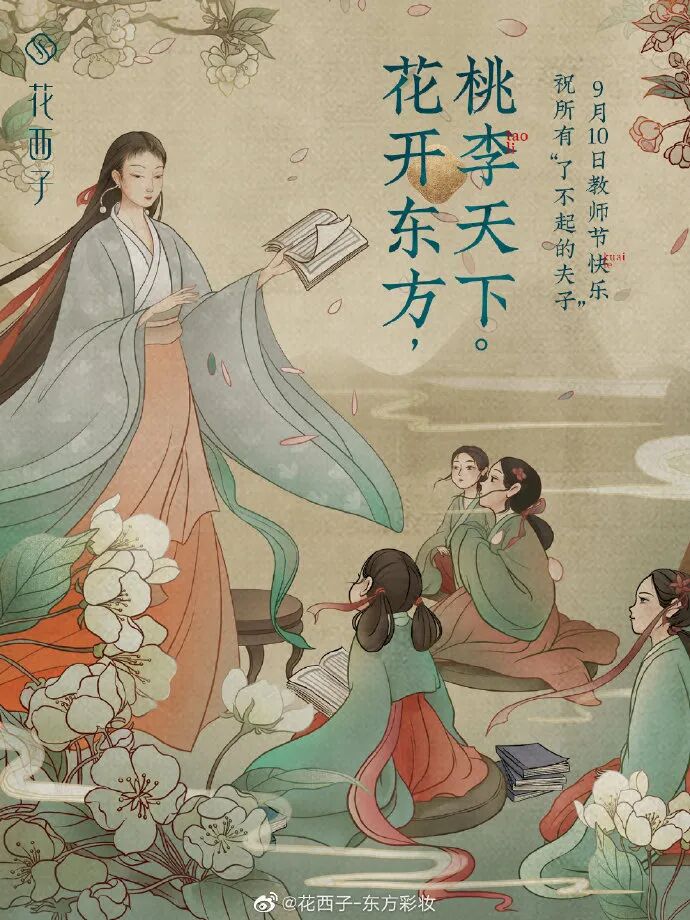 例如在99大促期间,花西子的淘宝旗舰店开启了电商活动,同时在官方微博中则更强调教师节活动,以中国师生文化“桃李天下”为主题,与消费者进行互动。