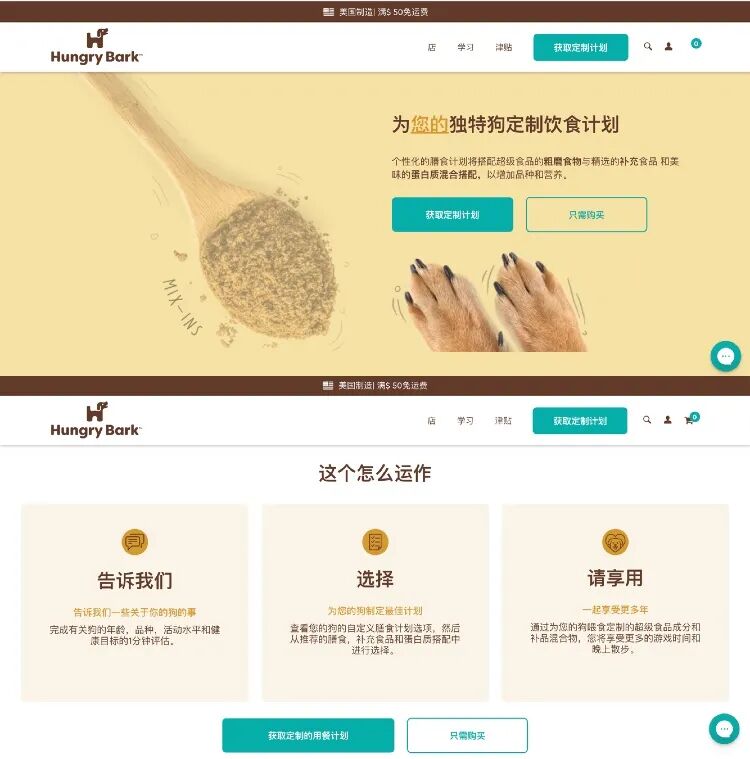 成立于2020年的Hungry Bark也为宠物们提供定制营养计划,除了主粮以外,还增加了营养补充剂,包括强健骨骼、补充益生菌和增强心脏功能等功效产品和蛋白质混合物,拓展了宠物食物定制化的市场。
