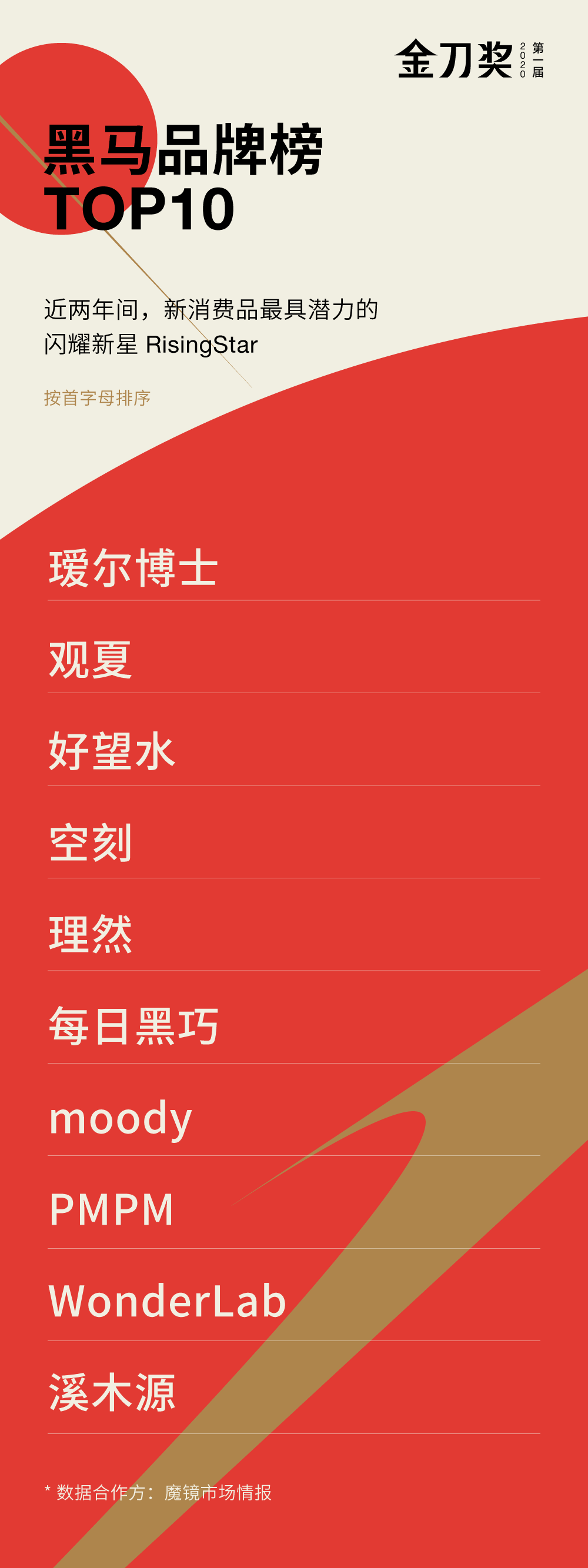 最终在经过22位各行业顶尖专家、专业数据研究机构、以及上万名行业人士参与大众评选后,我们综合各方考评,「2020金刀榜-黑马品牌榜」上榜TOP10现已出炉,恭喜上榜品牌,你们让行业看到了中国新消费品最具潜力的闪耀新星 RisingStar。