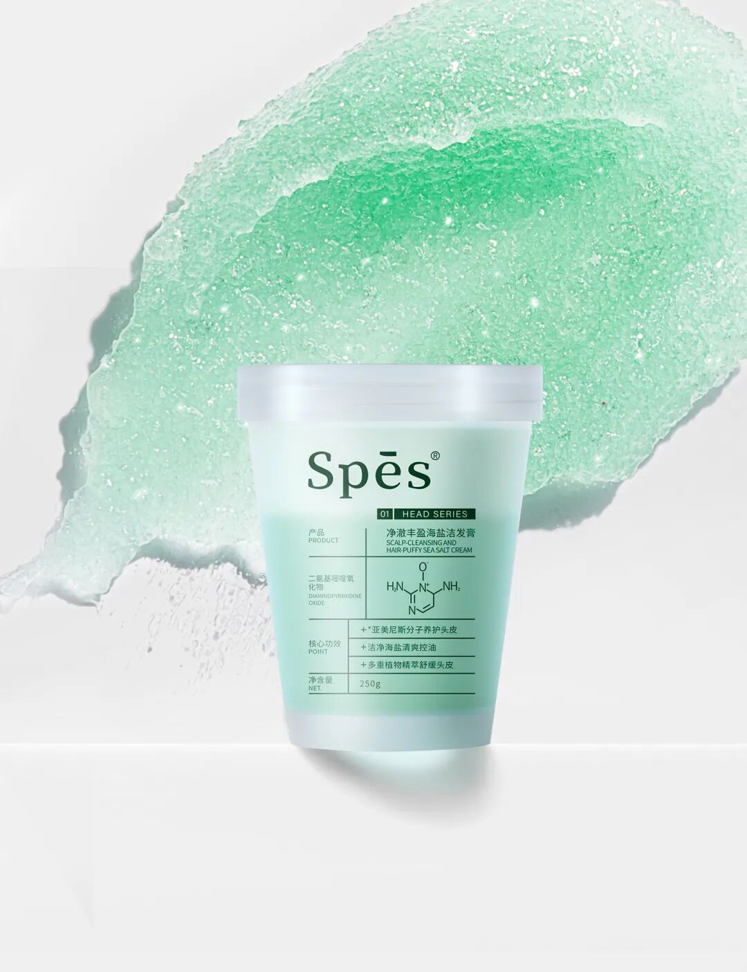 在包材设计上,Spēs选用了绿色透明的瓶体,这样既能展现VE颗粒珠子,让消费者直观感受到产品的效能,又用绿色来暗示活力和生命力,隐喻促进头发新生。